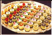 fold in the egg whites whipped to a stiff snow with the caster sugar and carefully draw in the flour and the csndied fruit. Put a 20 cm. square greaspaper on top of a baking tray spread over the mixture and bake . When cold, split once and sandwich with apricot puree, cut out with a round cutter and cover the sides very thinly with marzipan. to make the meringue, whip the egg whites stiffy with the caster sugar, then stir in the icing sugar. pipe on top the petits fours and flash. |