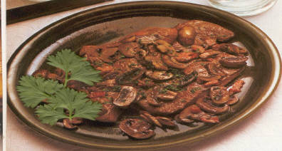 arrange the slices of the fillet steak on top without overlapping. Sprinkle with lemon juice, parsley, salt and freshly ground black pepper, cover and cook at low heat for about 15 minutes turning the steak once or twice through cooking. Serve very hot. |