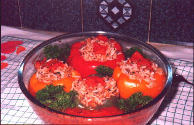 parsley fry for 2 minutes add tomato salt and pepper cook for further 5 minutes stir well, pour over the peppers, cover with tin foil and put in the oven at 200c for about 1 hour. Can be served hot O cold. |