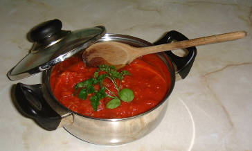 chopped tomatoes, season well with salt and freshly ground black pepper, bring to the boil reduce the heat and simmer for 1/2 hour, when it is nearly cooked add the basil. |